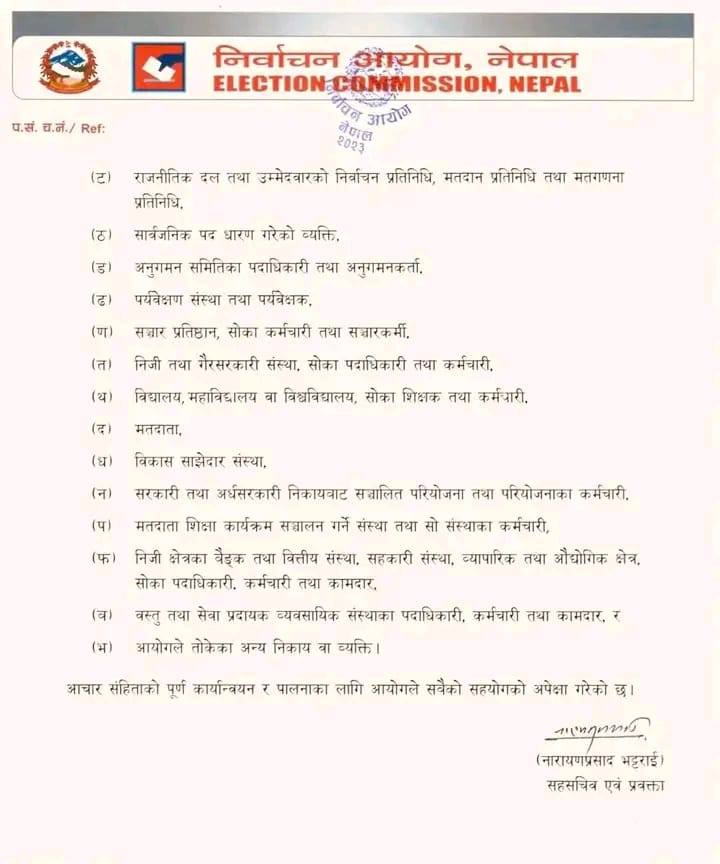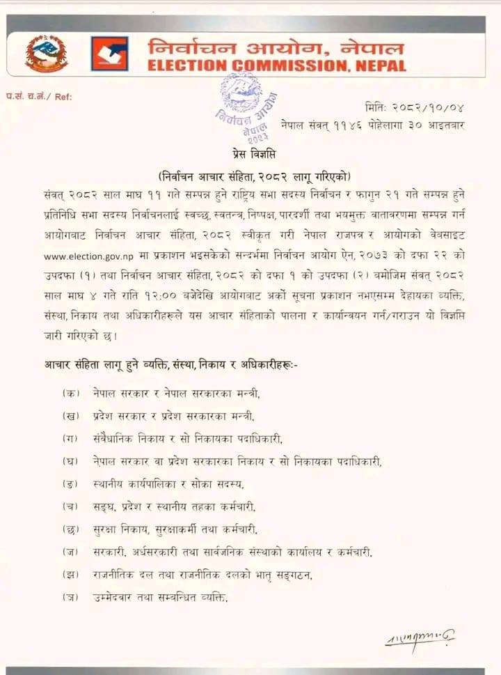 निर्वाचन आयोगको आज बसेको बैठकले याे निर्णय गरेको सहायक प्रवक्ता कुलबहादुर जिसीले जानकारी दिनुभयो । चुनावमा स्वतन्त्रता, स्वच्छता, निष्पक्षता, पारदर्शिता, मितव्ययिता तथा भयमुक्त वातावरण कायम राख्न आवश्यक भएकाले निर्वाचन आयोग ऐन २०७३ को दफा २२ ले दिएको अधिकार प्रयोग गरि आयोगले आचारसंहिता लागू गरेको उहाँले बताउनुभयो ।