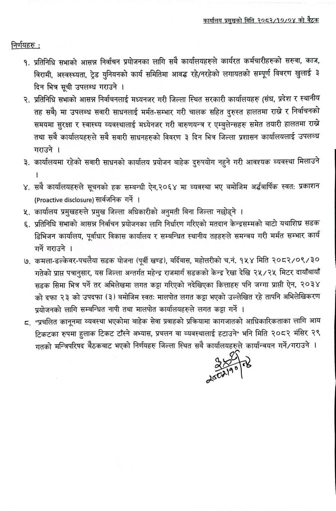 निर्वाचन अवधिमा कार्यालय प्रमुखहरूले प्रमुख जिल्ला अधिकारीको अनुमति बिना जिल्ला नछोड्न निर्देशन दिइएको छ । मतदान केन्द्रसम्म पुग्ने बाटोको अवस्था सुधार गर्न सडक डिभिजन कार्यालय, पूर्वाधार विकास कार्यालय तथा सम्बन्धित स्थानीय तहबीच समन्वय गरी यथाशीघ्र मर्मत कार्य अघि बढाउन पनि बैठकले जोड दिएको छ ।