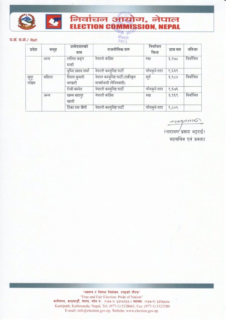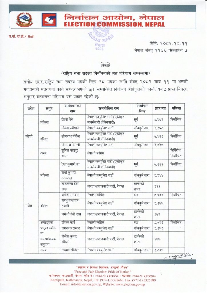 काठमाडौँ – आइतबार सम्पन्न राष्ट्रियसभा सदस्य पदका लागि भएको निर्वाचनको अन्तिम परिणाम सार्वजनिक गरिएको छ । आज राष्ट्रियसभामा रिक्त रहेको १८ पदका लागि निर्वाचन भएको थियो ।