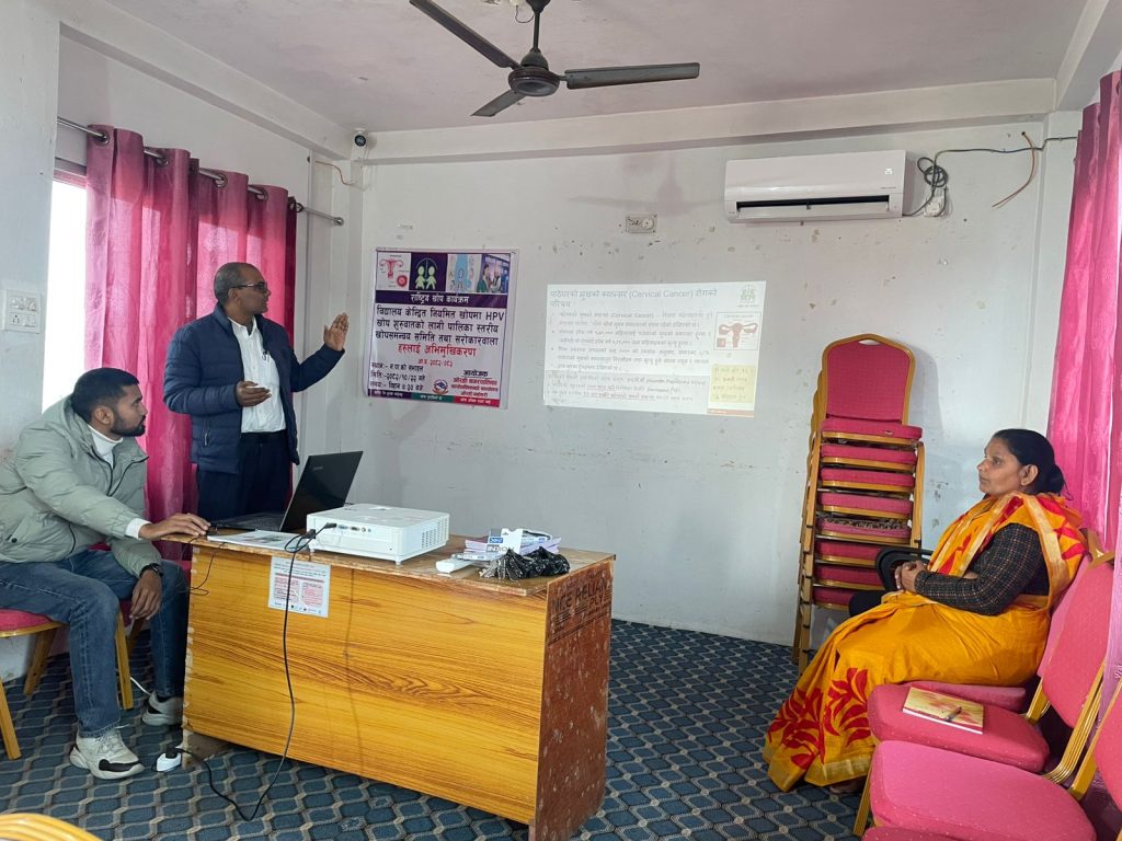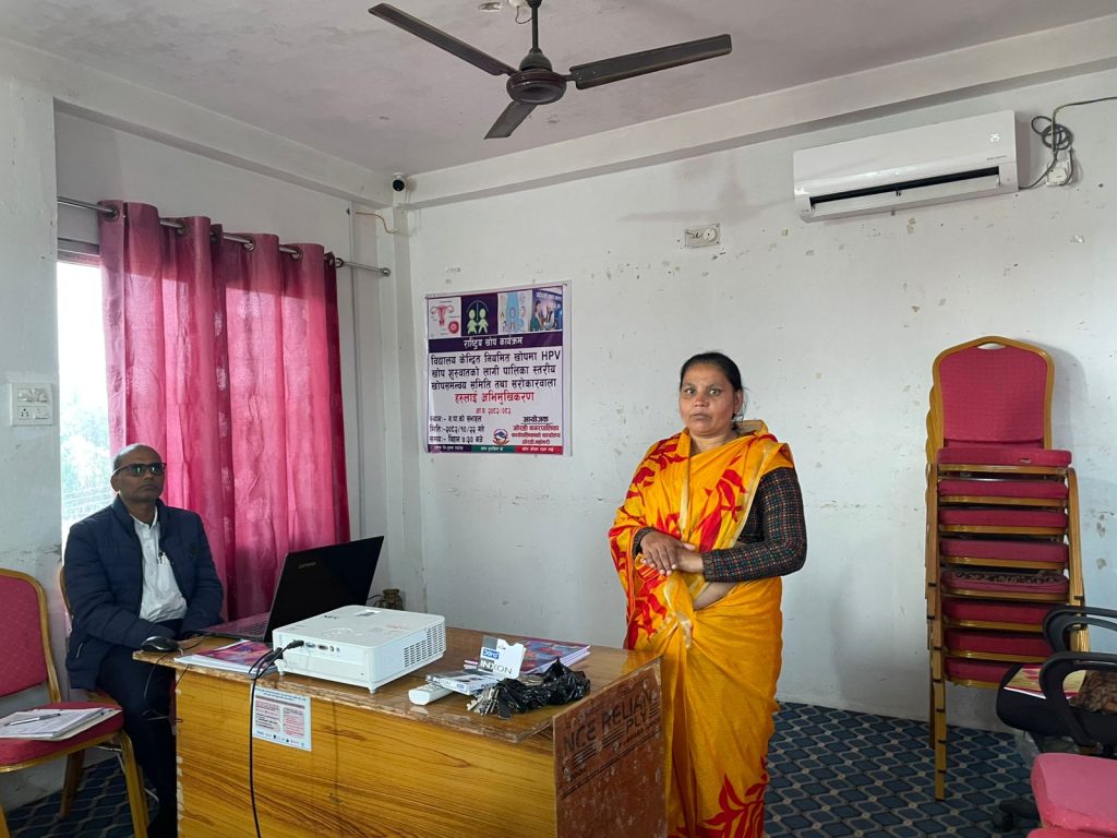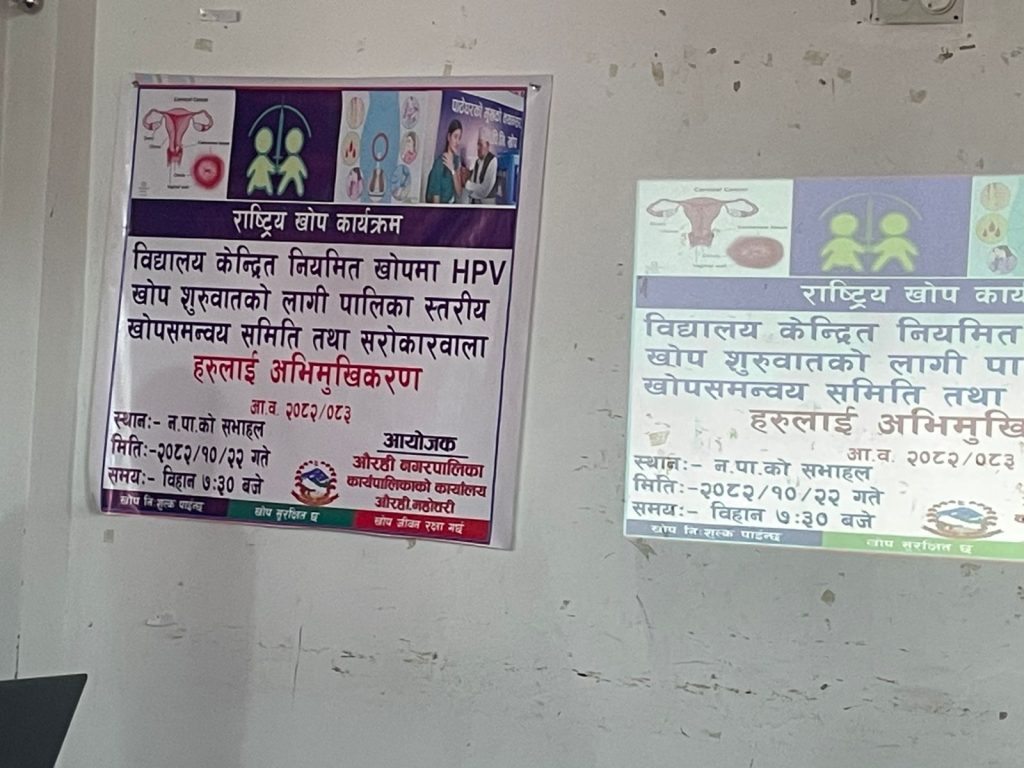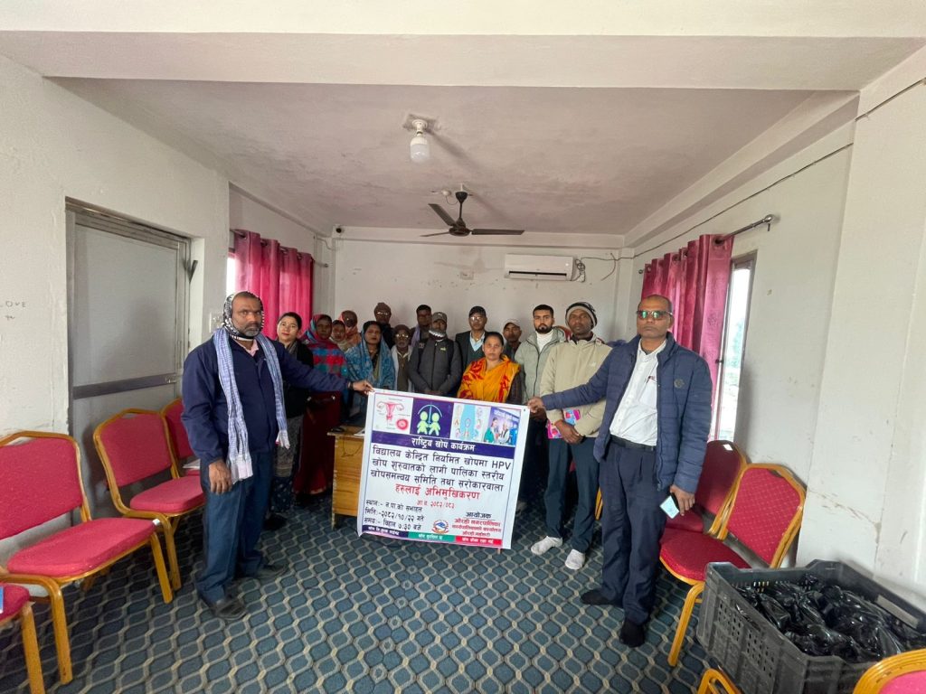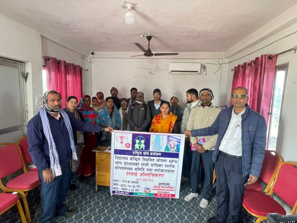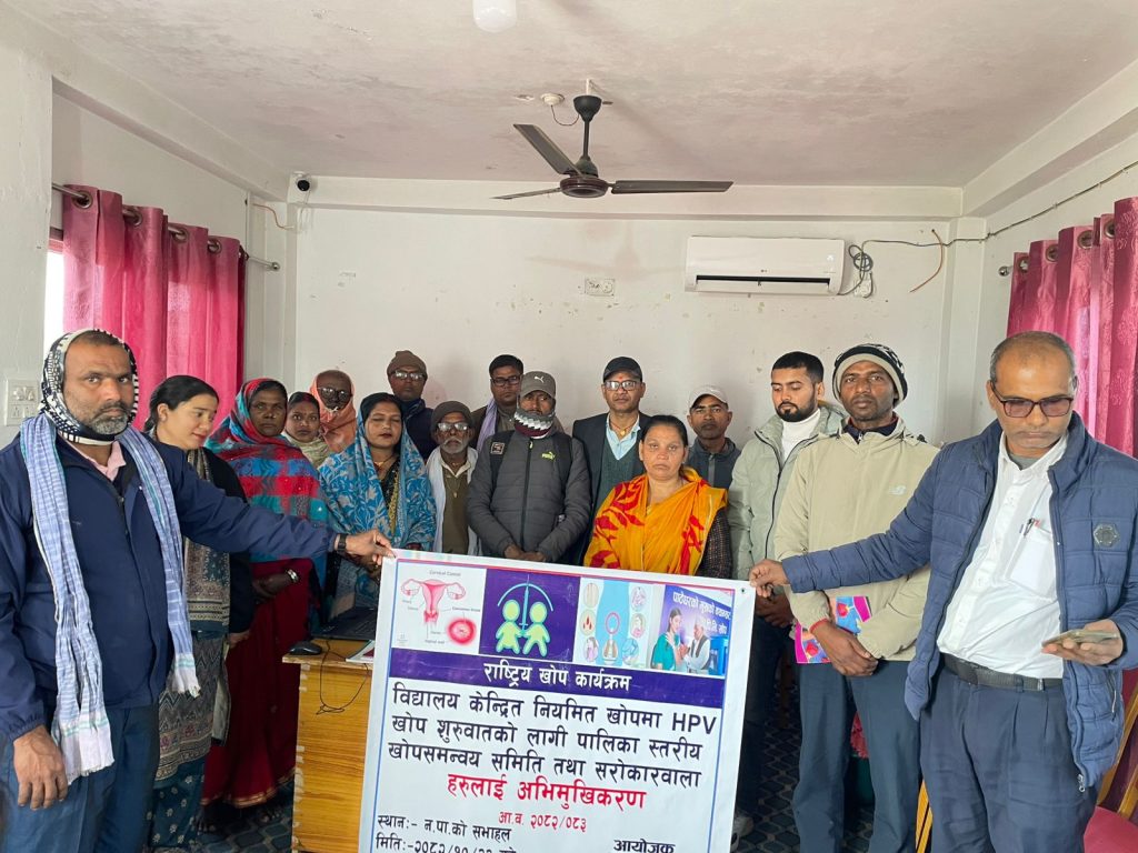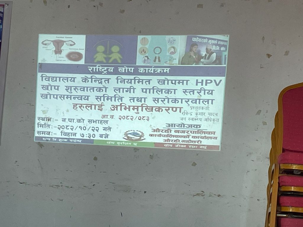 निमित्त नगर प्रमुख तथा नगर उपप्रमुख रेणु झाको अध्यक्षतामा सम्पन्न उक्त कार्यक्रममा वडा नम्बर २, ३, ४ र ९ का वडा अध्यक्ष, कार्यपालिका सदस्य सनिचरी देवी मण्डल, नगरपालिकाका कर्मचारी तथा स्वास्थ्य शाखामा कार्यरत कर्मचारीहरूको सहभागिता रहेको थियो। पालिकास्तरीय खोप समन्वय समितिलाई लक्षित गरी एचपीभी खोप अभियानसम्बन्धी एकदिने अभिमुखीकरण गोष्ठी सञ्चालन गरिएको स्वास्थ्य संयोजक यादवले जानकारी दिनुभयो।
