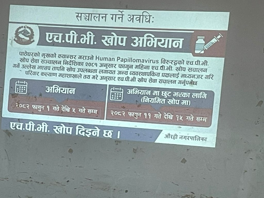 नगरपालिकामा फाल्गुन १ गतेदेखि ७ गतेसम्म खोप अभियान सञ्चालन हुनेछ। तथ्यांकअनुसार विद्यालयमा अध्ययनरत ३३७ जना किशोरी तथा विद्यालय बाहिर रहेका १० देखि १४ वर्ष उमेर समूहका करिब १३० जना गरी पालिकाभर करिब ४६७ किशोरीलाई एचपीभी खोप लगाइने छ।