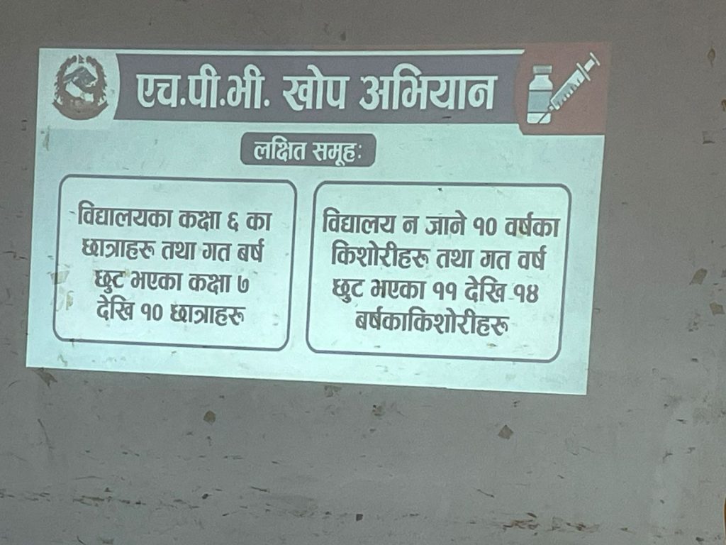 नगरपालिकाभित्र रहेका सामुदायिक तथा निजी विद्यालयमा अध्ययनरत कक्षा ६ देखि १० सम्मका किशोरी तथा विद्यालय नजाने किशोरीलाई लक्षित गरी खोप अभियान सञ्चालन गरिने नगरपालिकाका स्वास्थ्य संयोजक रबिन्द्र यादवले बताउनुभयो। उहाँले लक्षित समूहका किशोरीहरूलाई खोप केन्द्रसम्म ल्याउन अभिभावक, शिक्षक तथा समुदायको सक्रिय सहभागिता आवश्यक रहेको उल्लेख गर्नुभयो।