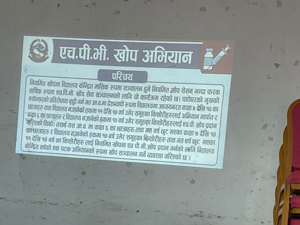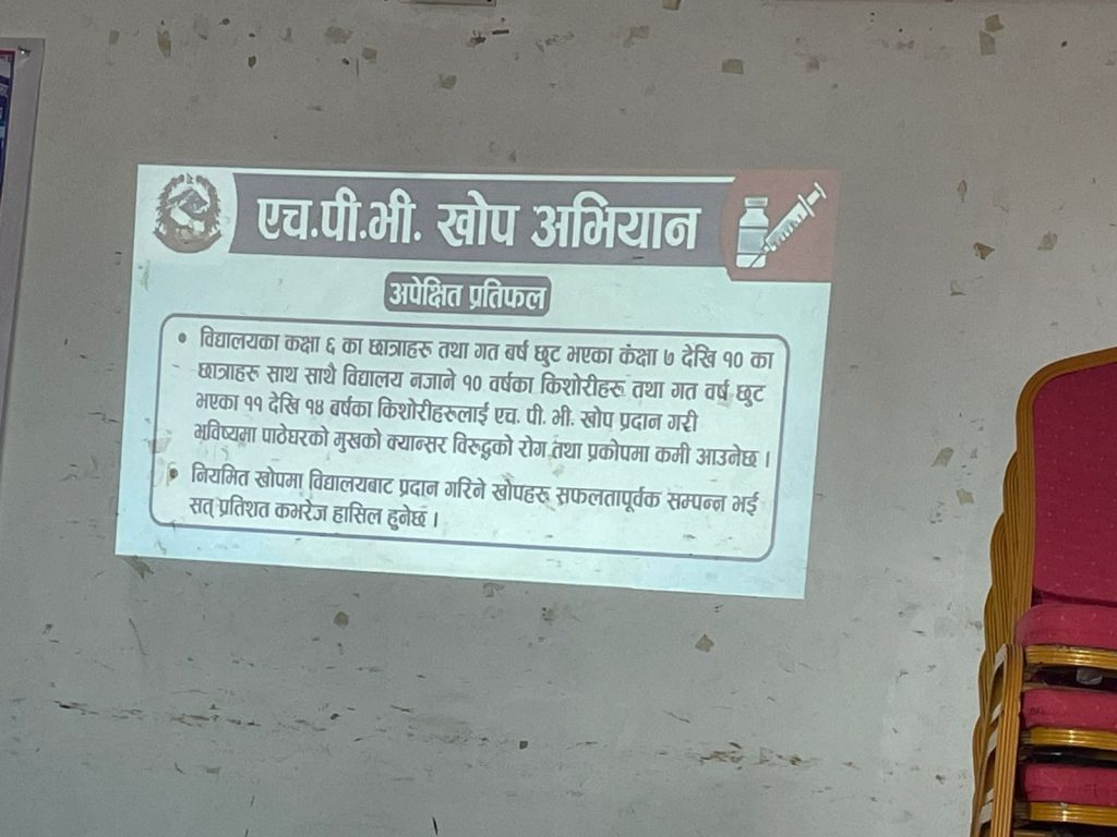 अभिमुखीकरण कार्यक्रममा खोप अभियानका उद्देश्य, लक्ष्य, अपेक्षित उपलब्धि तथा यसले किशोरीहरूको स्वास्थ्य, प्रजनन स्वास्थ्य र दीर्घकालीन जीवनस्तरमा पार्ने सकारात्मक प्रभावबारे जानकारी गराइएको थियो। साथै एचपीभी खोपसम्बन्धी जनचेतनामूलक सन्देश, खोपको फाइदा, खोप लगाउनुको उद्देश्य, सम्भावित सामान्य साइड इफेक्ट तथा खोपपछि अपनाउनुपर्ने सावधानीका विषयमा समेत स्पष्ट पारिएको थियो।
