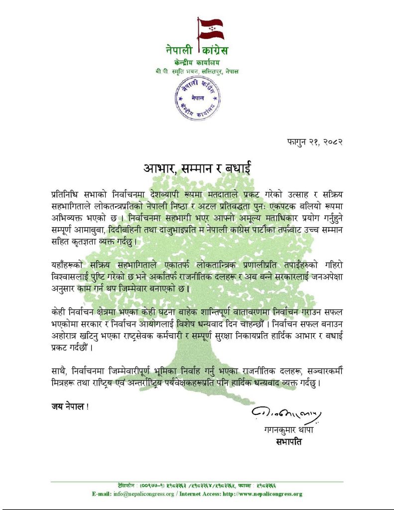 काठमाडौँ । नेपाली कांग्रेसका सभापति गगन कुमार थापाले प्रतिनिधिसभाको निर्वाचनमा देशव्यापी रुपमा मतदाताले प्रकट गरेको उत्साह एवम् सक्रिय सहभागीताले लोकतन्त्रप्रतिको निष्ठा अभिव्यक्त भएको बताउनुभएको छ ।