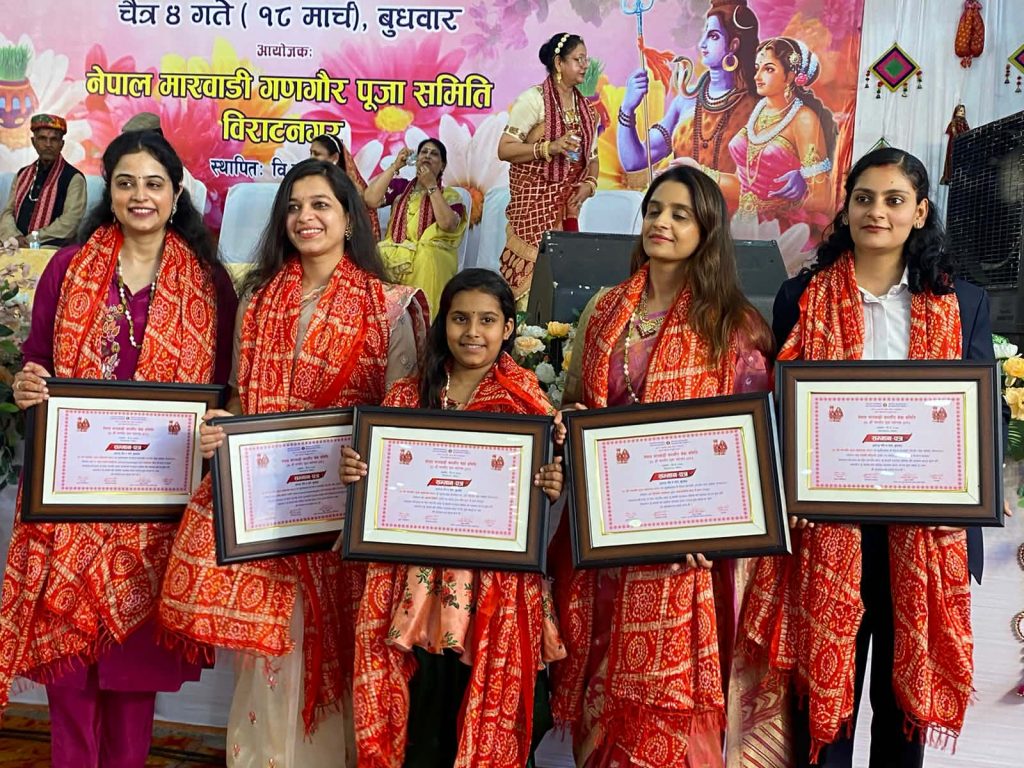 विराटनगरमा आयोजित ३९औं गणगौर पूजा महोत्सव–२०८२ अन्तर्गत बुधबार अतिथि साधन हलमा एक बाल योगीसहित पाँच जना महिलालाई सम्मान गरिएको छ।