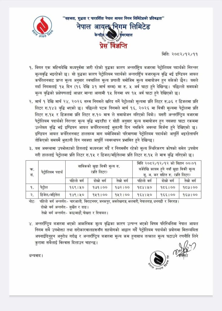 अन्तर्राष्ट्रिय बजारमा मूल्य वृद्धि भइरहेकाले आन्तरिक बजारमा पनि समायोजन गर्नुपरेको निगमले जनाएको छ। मार्च १ देखि २४ तारिखसम्म पेट्रोल खरिद मूल्यमा प्रतिलिटर ७६ रुपैयाँ र डिजेलमा १४३ रुपैयाँसम्म वृद्धि भएको निगमको भनाइ छ।