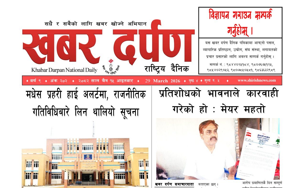 खबर दर्पण राष्ट्रिय दैनिक १५ गते चैत २०८२