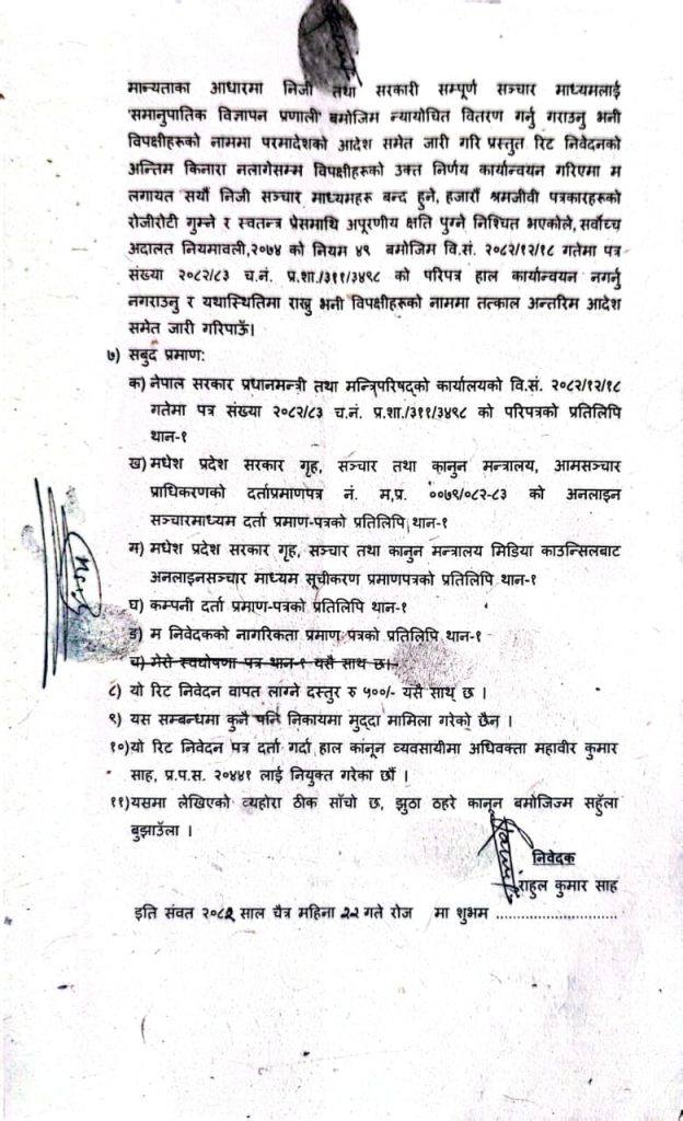 जनकपुरधाम । सरकारी विज्ञापन वितरणसम्बन्धी नेपाल सरकारको नयाँ नीतिविरुद्ध सर्वोच्च अदालतमा रिट निवेदन दर्ता भएको छ ।