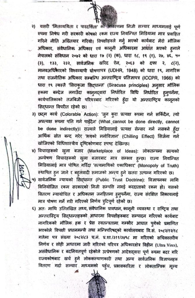 रिट निवेदनमा प्रधानमन्त्री तथा मन्त्रिपरिषद्को कार्यालयबाट चैत १८ गते जारी परिपत्रमार्फत ‘मितव्ययिता र पारदर्शिता’को नाममा विज्ञापन वितरणलाई सीमित गरिएको उल्लेख छ ।