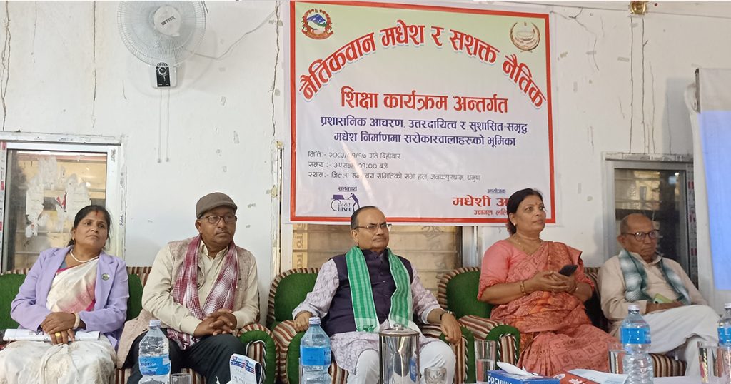 मधेसी आयोगको आयोजना तथा इन्सेकको सहकार्यमा आज जनकपुरधाममा ‘नैतिकवान मधेस र सशक्त नैतिक शिक्षा’ कार्यक्रमअन्तर्गत ‘प्रशासनिक आचरण, उत्तरदायित्व र सुशासित–समृद्ध मधेस निर्माणमा सरोकारवालाहरूको भूमिका’ विषयक अन्तक्र्रिया सम्पन्न भएको थियो।