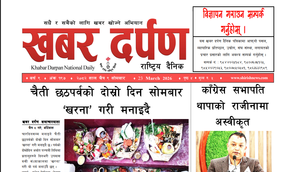 खबर दर्पण राष्ट्रिय दैनिक ५ गते बैशाख २०८३